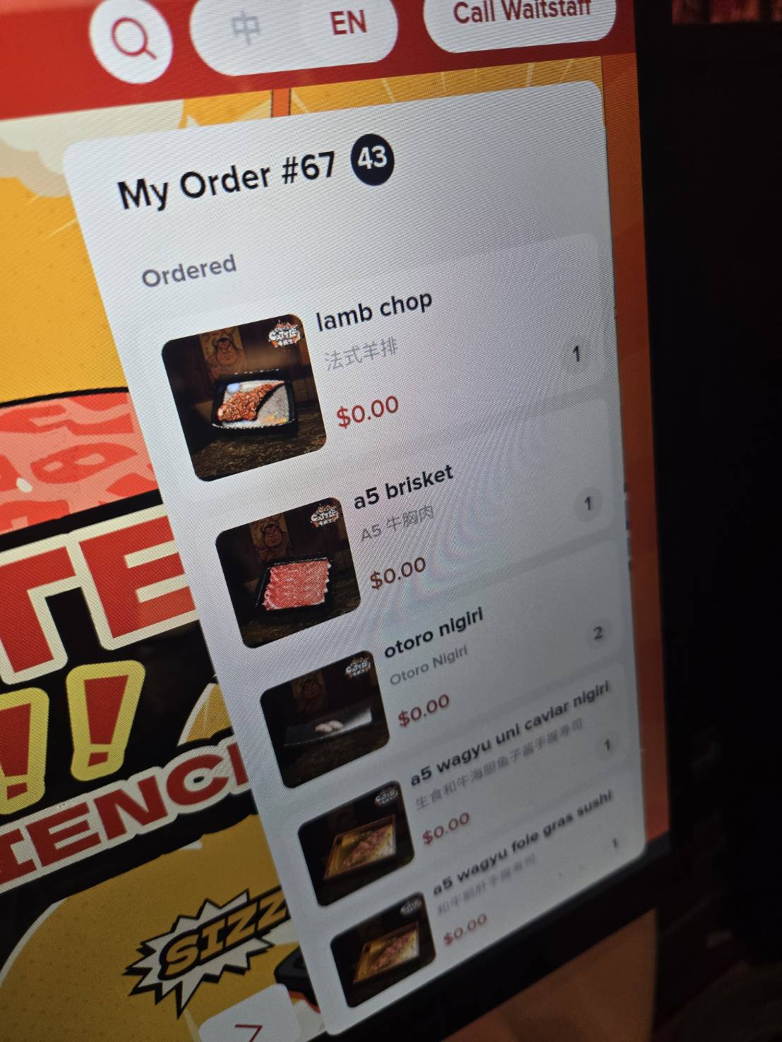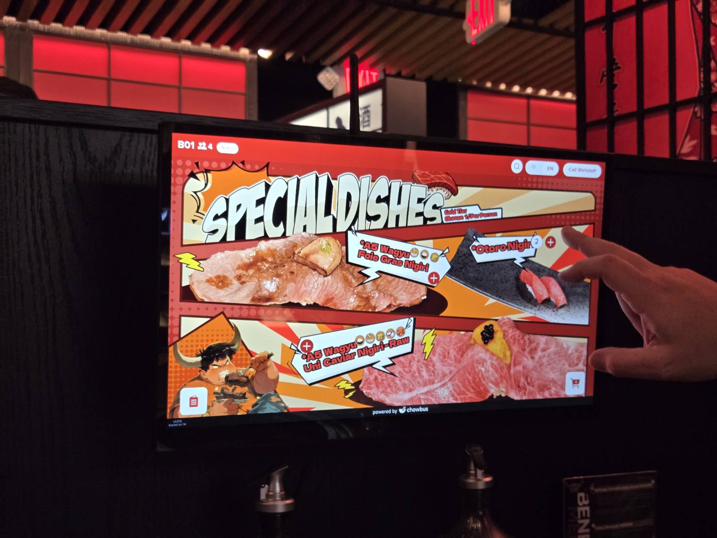 全てタッチパネルでの注文になっていて、一度に最大10皿まで注文可能。注文後は、その7分後?に再度注文可能になります。